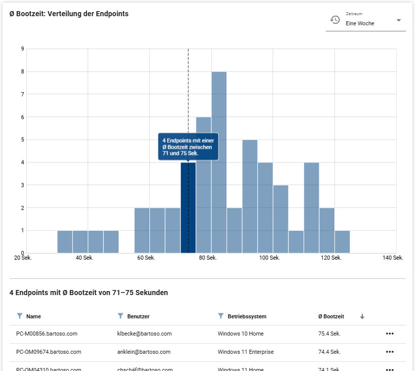 Durchschnittliche Bootzeit: Verteilung der Endpoints: In der rechten Grafik sehen Sie die Verteilung aller Endpoints der gewählten Umgebung mit ihrer durchschnittlichen Bootzeit im Balkendiagramm. Durch Hovern mit der Maus über die einzelnen Balken, sehen Sie im Tooltip die Details: Wie viele Endpoints sind zum ausgewählten Zeitraum von dieser durchschnittlichen Bootzeit betroffen? Ein Klick auf einen Balken öffnet Ihnen die Details sowie die betroffenen Endpoints unterhalb des Diagramms. Von dort aus springen Sie bei Bedarf durch Klicken auf einen Endpoint direkt in dessen Detailansicht.