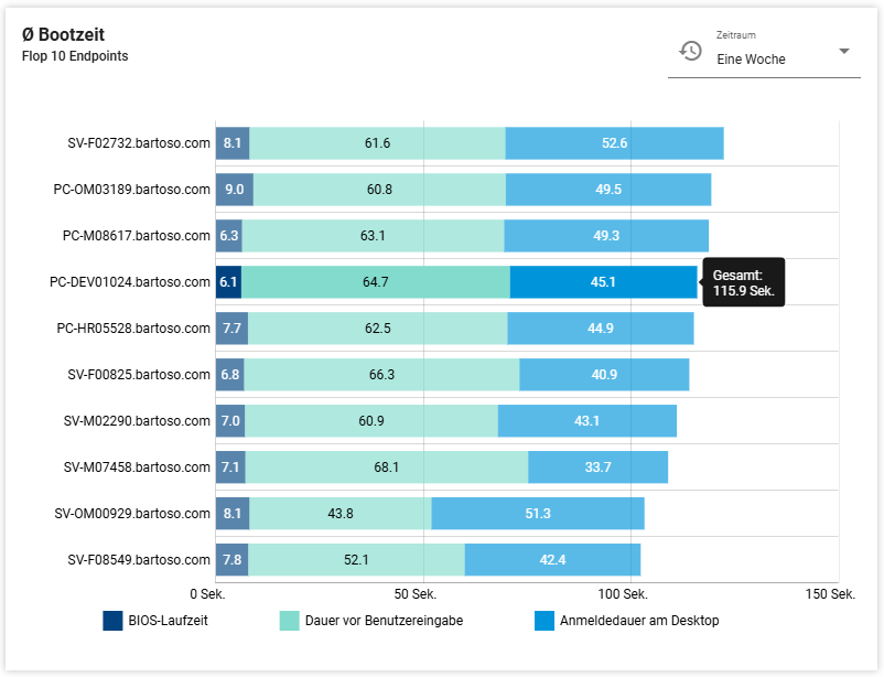 Durchschnittliche Bootzeit: Flop 10: Die linke Grafik zeigt Ihnen die Flop 10 Bootzeiten je Endpoint. Die vertikale Achse zeigt die Namen der betroffenen Endgeräte, die horizontale Achse die Länge der Bootzeit, aufgeteilt in BIOS-Laufzeit, Dauer vor Benutzereingabe und Anmeldedauer am Desktop. Durch Klicken auf einen Endpunkt öffnet sich die Detailansicht zu diesem Endgerät.
