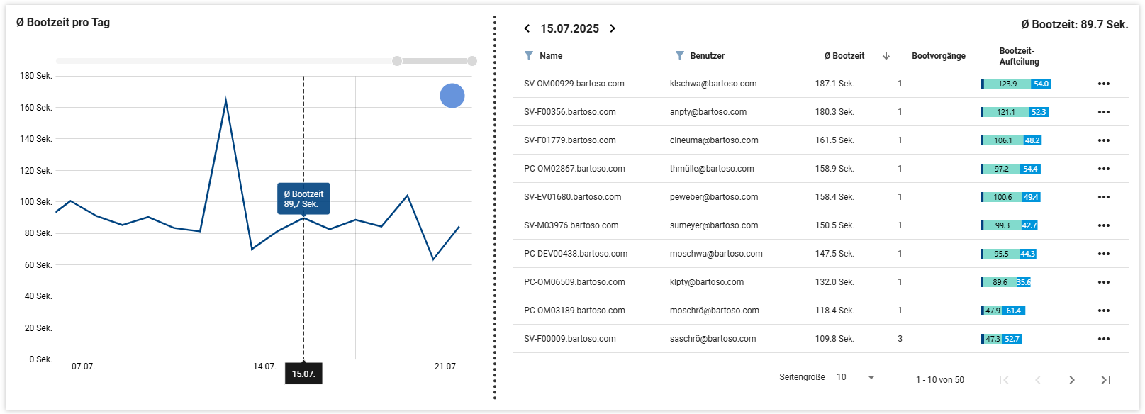 Darunter folgt die Übersicht im zeitlichen Verlauf: Sie sehen die durchschniitliche Bootzeit pro Tag für alle Endpoints. Durch Klick auf einen Zeitpunkt in der Grafik links sehen Sie rechts in der zugehörigen Tabelle die an diesem Tag betroffenen Endpoints mit ihren Nutzern und den Einzeldaten zu Bootzeit. Über das Drei-Punkte-Menü rechts eines jeden Endpoints öffnen Sie diesen in der Detailansicht.