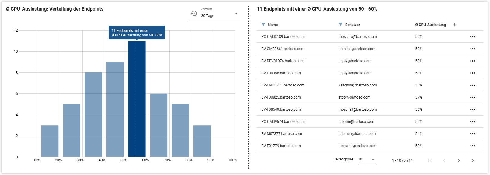 Durchschnittliche CPU-Auslastung: Verteilung der Endpoints: Hier sehen Sie im gewählten Zeitraum, wie sich die durchschnittliche CPU-Auslastung über die Endpoints verteilt. Um die einzelnen Endpoints einer durchschnittlichen Auslastungsstufe zu sehen, wählen Sie den gewünschten Balken links aus: Sie sehen auf der rechten Seite die Liste der betroffenen Endpoints mit der entsprechenden Auslastung. Von dieser Liste können Sie direkt zu den Detailansichten der einzelnen Endpoints navigieren oder diese über das Drei-Punkte-Menü in einem neuen Tab öffnen.