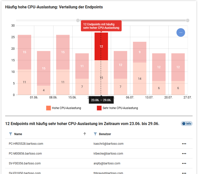 Häufig hohe CPU-Auslastung: Verteilung der Endpoints: Die Grafik zeigt Ihnen diejenigen Endpoints, welche von häufig sehr hoher oder hoher CPU-Auslastung betroffen sind. Der Zeitraum erstreckt sich immer über die vergangenen 90 Tage. Die einzelnen Balken zeigen immer den Durchschnittswert einer Woche bzw. von sieben Tagen (Montag bis Sonntag). Innerhalb der Balken sehen Sie die Verteilung zwischen den beiden Auslastungsstufen (hoch/sehr hoch). Verändern Sie die zeitliche Ansicht, indem Sie das Mausrad oder den grauen Zoombalken am oberen Rand der Grafik nutzen, um ein- oder auszuzoomen. Das blaue Minus-Icon setzt den Zoom-Zustand wieder zurück auf den vollen Zeitraum. Details: Sobald Sie einen Balken und dessen Bereich (hoch/sehr hoch) im Diagramm auswählen, sehen Sie unterhalb der Grafik eine Liste mit den in diesem Zeitraum betroffenen Endpoints. Von dieser Liste können Sie direkt zu den Detailansichten der einzelnen Endpoints navigieren oder diese über das Drei-Punkte-Menü in einem neuen Tab öffnen.