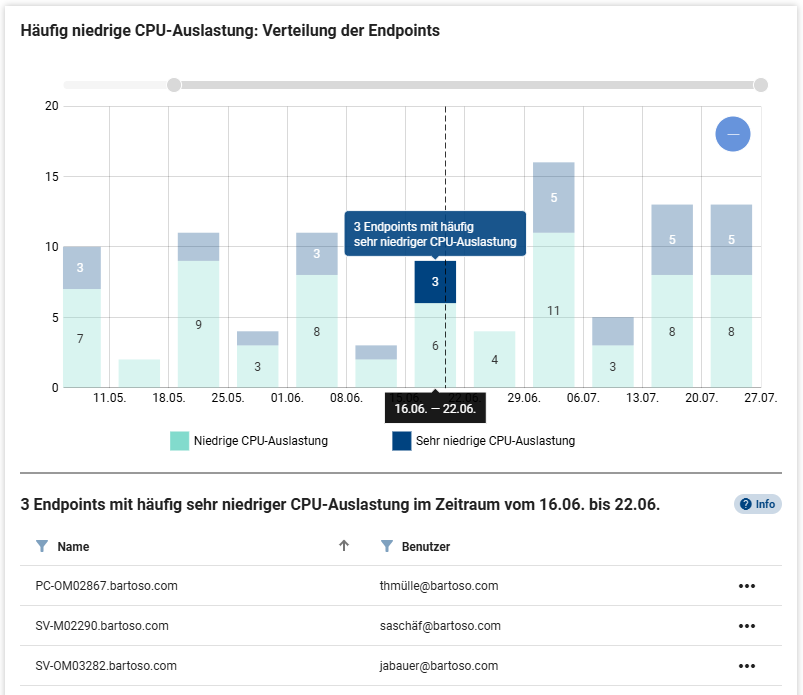 Häufig niedrige CPU-Auslastung: Verteilung der Endpoints: Die Grafik zeigt Ihnen diejenigen Endpoints, welche von häufig sehr niedriger oder niedriger CPU-Auslastung betroffen sind. Der Zeitraum erstreckt sich immer über die vergangenen 90 Tage. Die einzelnen Balken zeigen immer den Durchschnittswert einer Woche bzw. von sieben Tagen (Montag bis Sonntag). Innerhalb der Balken sehen Sie die Verteilung zwischen den beiden Auslastungsstufen (hoch/sehr hoch). Verändern Sie die zeitliche Ansicht, indem Sie das Mausrad oder den grauen Zoombalken am oberen Rand der Grafik nutzen, um ein- oder auszuzoomen. Das blaue Minus-Icon setzt den Zoom-Zustand wieder zurück auf den vollen Zeitraum. Details: Sobald Sie einen Balken und dessen Bereich (hoch/sehr hoch) im Diagramm auswählen, sehen Sie unterhalb der Grafik eine Liste mit den in diesem Zeitraum betroffenen Endpoints. Von dieser Liste können Sie direkt zu den Detailansichten der einzelnen Endpoints navigieren oder diese über das Drei-Punkte-Menü in einem neuen Tab öffnen.