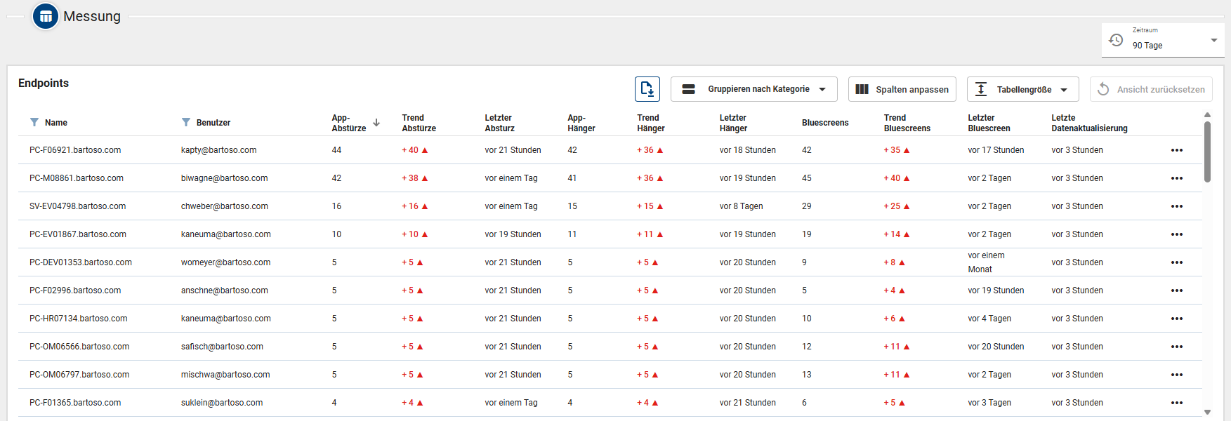 In der Liste unterhalb des Diagramms sehen Sie die betroffenen Endpoints bezogen auf den jeweils oben ausgewählten Fehlercode (Zeile im Diagramm). Sie sehen auf einen Blick den dem Gerät zugeordneten Benutzer, die Anzahl der App-Abstürze auf diesem Gerät sowie die Zahl der betroffenen Applikationen. Die Tabellenspalten sind nach oben und unten sortierbar, bei Name und Benutzer steht Ihnen der Freitextfilter zur Verfügung. Für Details zu einem Gerät klicken Sie auf dessen Zeile oder öffnen Sie es über die drei Punkte rechts. Auf der Detailseite des Geräts ist der Bereich Messung dann bereits vorgefiltert nach dem ausgewählten Fehlercode.