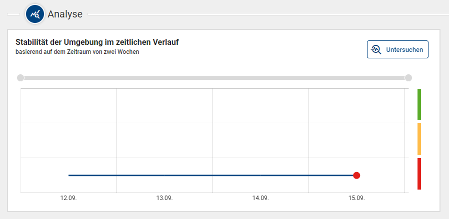Die Analysegrafik zeigt den gleitenden Durchschnittswert der Stabilität (über zwei Wochen) der ausgewählten Umgebung im zeitlichen Verlauf. Über den grauen Schieber zoomen Sie in bestimmte zeitliche Teilbereiche. Durch Hovern mit der Maus über den Zeitstrahl sehen Sie den jeweiligen Status zum entsprechenden Datum: grün = hohe Stabilität, gelb = mittlere Stabilität, rot = geringe Stabilität.