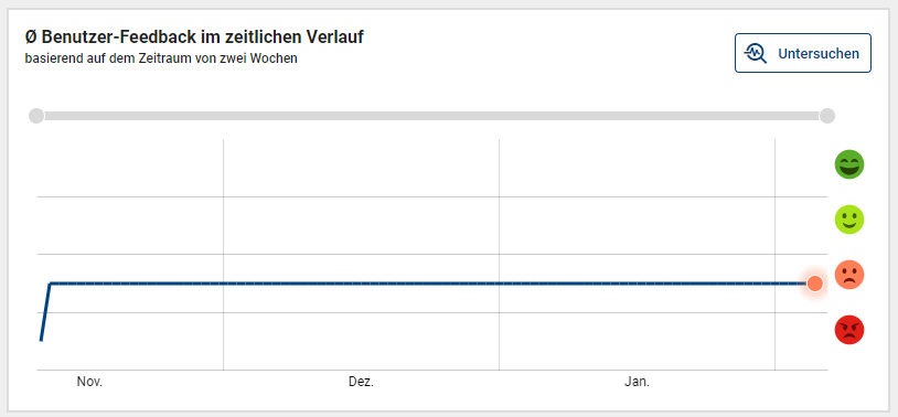 Die Grafik zeigt den gleitenden Durchschnittswert des Benutzer-Feedbacks (über zwei Wochen) im zeitlichen Verlauf. Durch Drehen des Mausrades oder Nutzen des grauen Schiebers oben in der Grafik zoomen sie ein oder aus. Bewegen Sie die Maus über den Zeitverlauf, so sehen Sie im Tooltipp die Detailangaben zu den einzelnen Tagen.