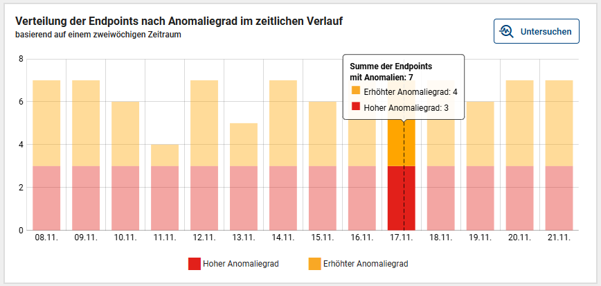 Die y-Achse gibt Ihnen immer die betroffene Anzahl der Endpoints (gelb und rot zusammen) an dem jeweiligen Tag/Datum (x-Achse). Im Tooltip sehen Sie die Gesamtanzahl der auffälligen Endpoints an diesem Datum sowie die Anzahl der Endpoints mit hohen und erhöhten Werten.