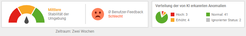 Der Tab Überblick zeigt Ihnen passend zur gewählten Umgebung und im gewählten Zeitraum (Auswahl im Bereich Messung) die Durchschnittswerte der Stabilität, des Benutzer-Feedbacks sowie des Anomaliegrades.
