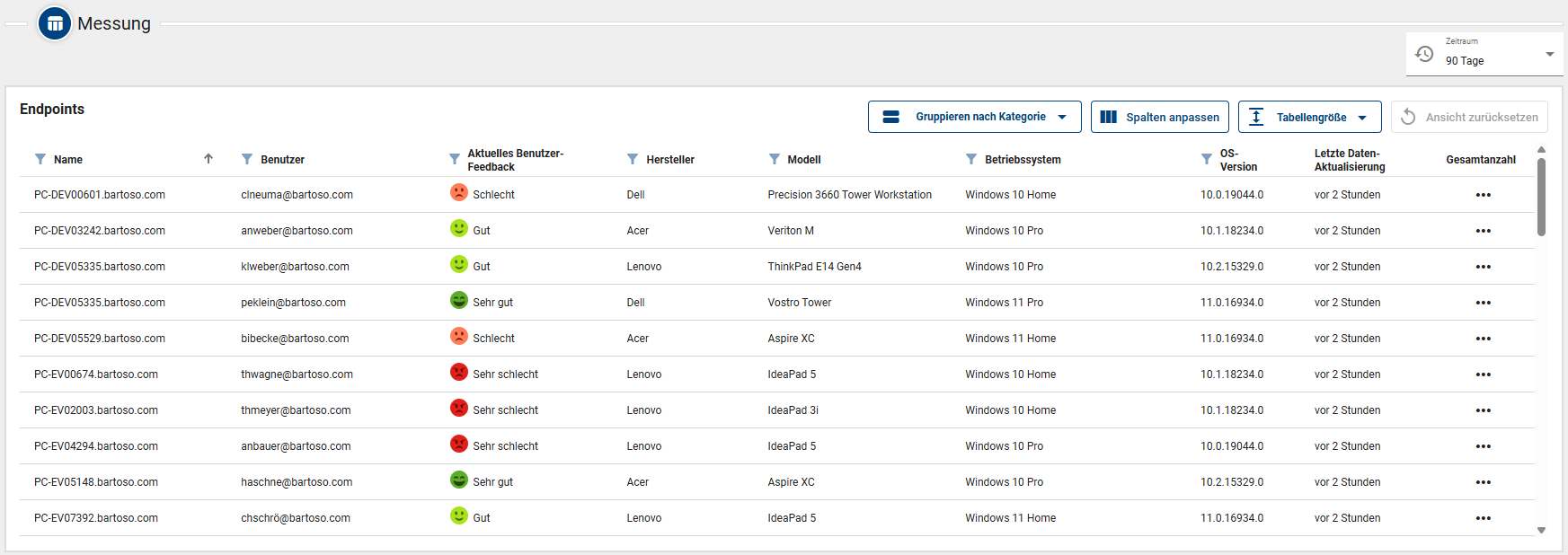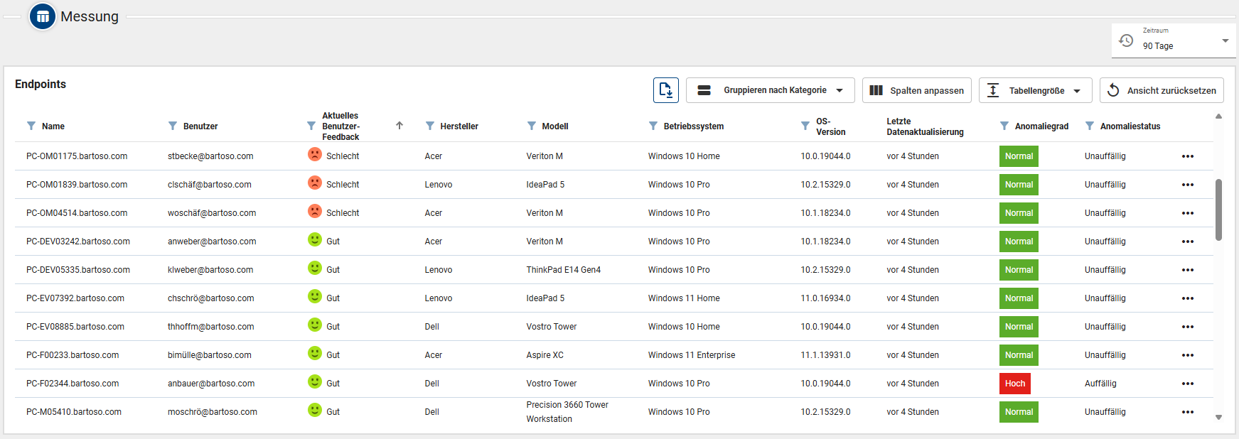 Im Bereich Messung sehen Sie alle in der gewählten Umgebung verfügbaren Endpoints gelistet. Die Endpoints sind standardmäßig nach Name sortiert.