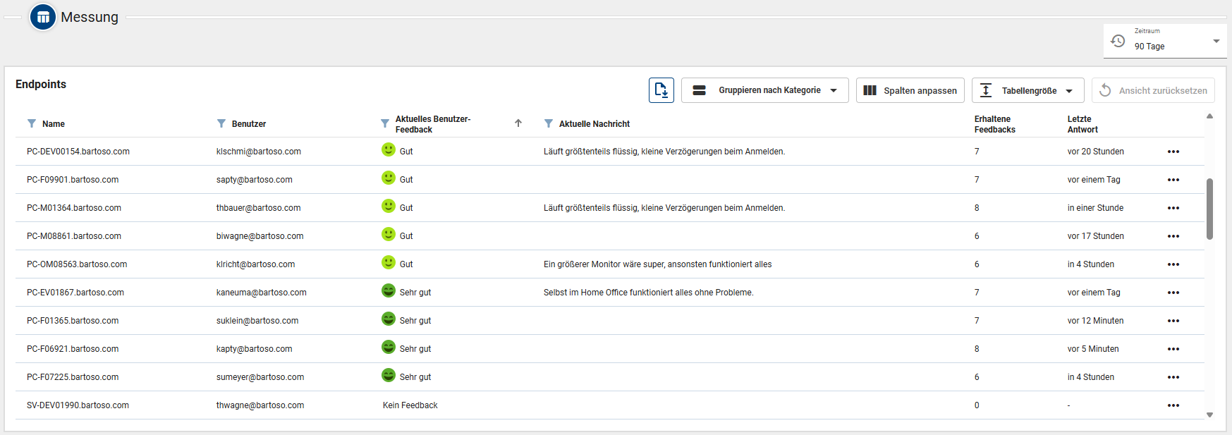 Im Bereich Messung sehen Sie alle Endpoints der von Ihnen gewählten Umgebung gelistet im gewählten Zeitraum, standardmäßig sortiert nach dem schlechtesten Feedback-Ergebnis.