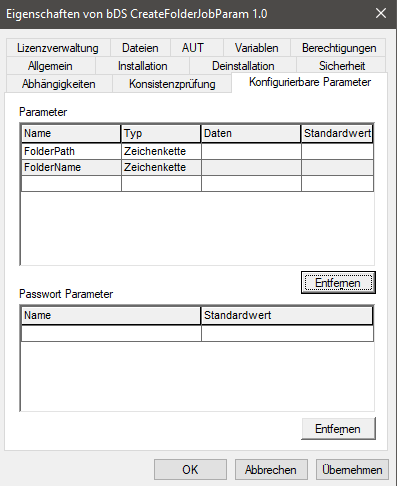 Das bDS wird anschließend im bMC als Applikation angelegt. In der Applikation steht dann der Reiter Konfigurierbare Parameter zur Verfügung, unter dem dann die beiden gewünschten Parameter festgelegt werden können. Die beiden Parameter FolderPath und FolderName werden hier mit dem Typ Zeichenkette festgelegt. Den Wert selbst geben Sie dann bei der Erstellung des Jobs an.