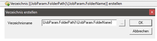 In diesem Beispiel wird im Automation Studio die Aktion Verzeichnis erstellen verwendet. In der Aktion werden dann für den Verzeichnisnamen die Variablen {JobParam.FolderPath} und {JobParam.FolderName} verwendet: