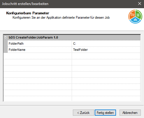 Das heißt, in diesem Beispiel werden im bDS die Variablen aufgelöst und aus dem Wert {JobParam.FolderPath}\{JobParam.FolderName} wird der Wert C:\TestFolder und das Verzeichnis wird erstellt. Für diese Applikation kann nun ein weiterer Job erstellt werden und wieder die gewünschten Werte für FolderPath und FolderName festgelegt werden. Es sind keinerlei Anpassungen im Skript mehr notwendig.